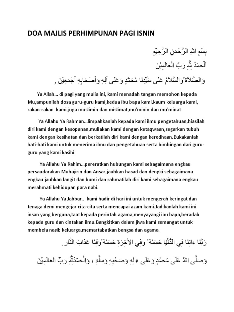 Contoh bacaan doa yang dapat digunakan untuk majlis rasmi dan tidak rasmi adalah seperti berikut. PERKARA 2. 1 Bacaan Doa Majlis Dalam Bahasa Melayu.